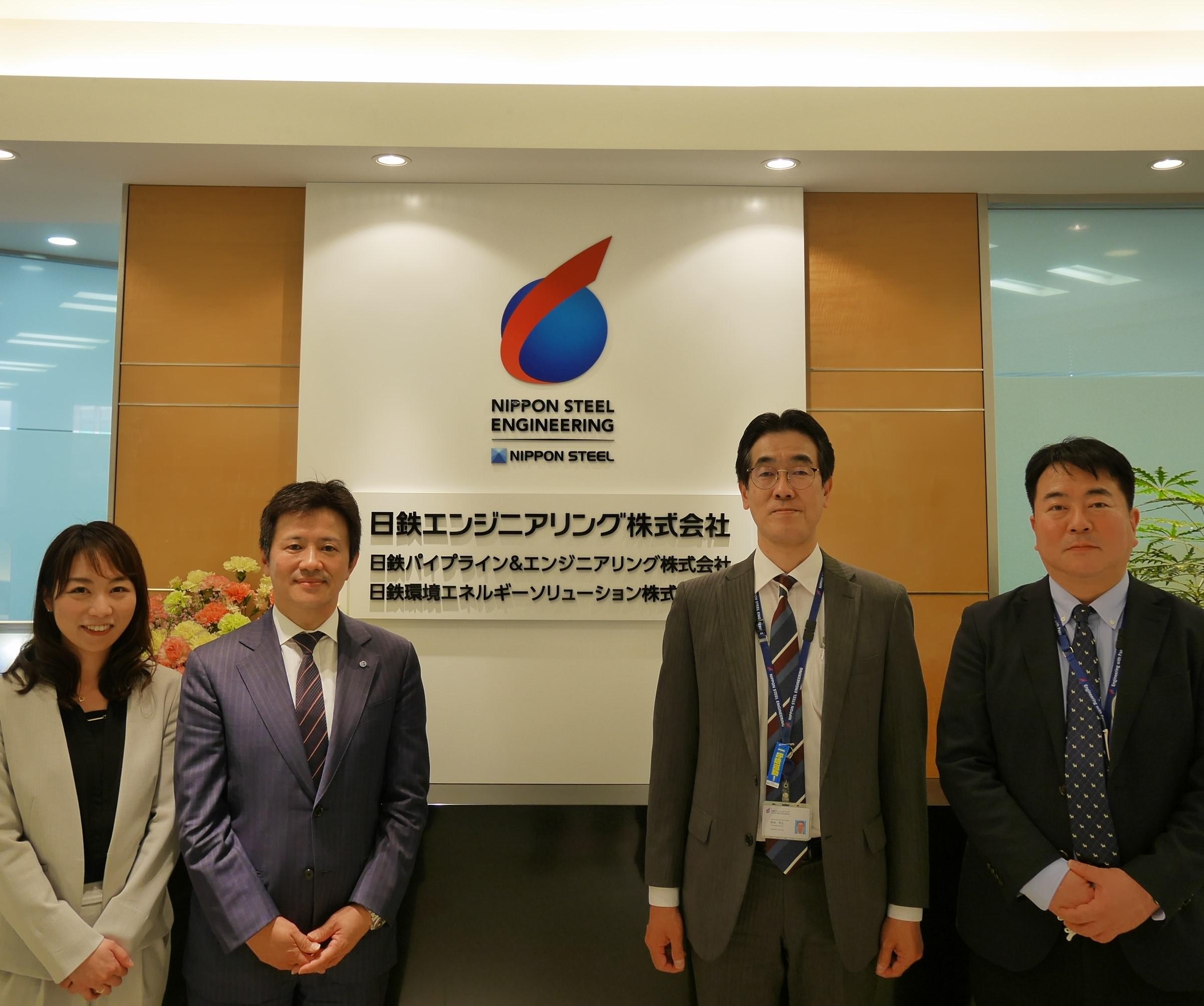 左から株式会社KMユナイテッド 事業営業統括責任者 大瀧真美様、CEO竹延幸雄様、日鉄エンジより都市インフラセクター 執行役員・建築本部長 岡田芳正、プロジェクト部シニアマネージャー 尾上和彦